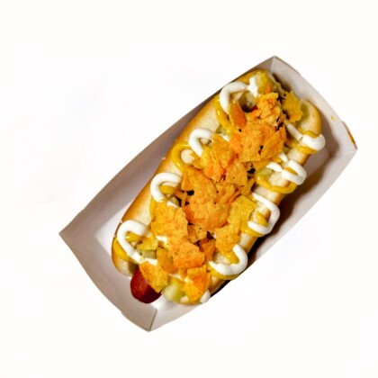 Булочка датская, Сосиска на выбор: говяжья либо куриная, Сыр Моцарелла, Кетчуп, Сырные чипсы