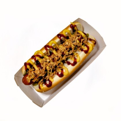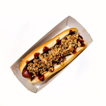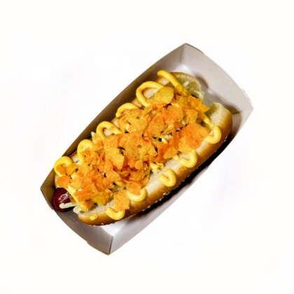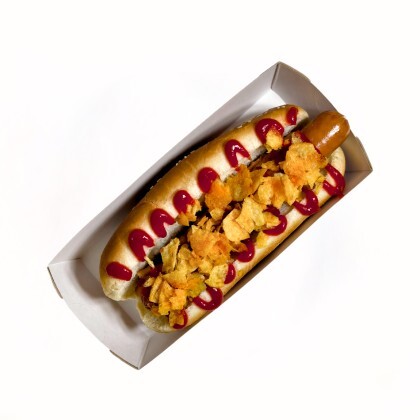Булочка датская, Сосиска на выбор: говяжья либо куриная, Ананасы, Горчичный соус, Чесночный соус, Сырные чипсы