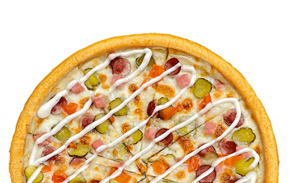 Чесночный соус ранч, сыр моцарелла, ветчина из говядины и цыпленка, охотничьи колбаски из говядины, корнишоны, свежие томаты
